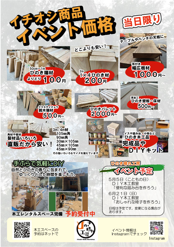 当日限定で、耳付き板や銘木も大特価で販売します。